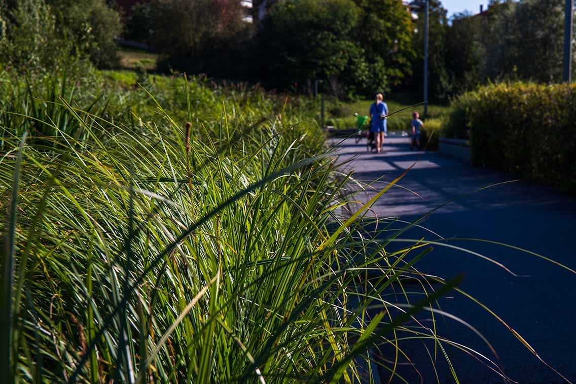 En åpen fordrøyningsløsning er sjelden et frittstående tiltak, men snarere en viktig del av en helhetlig overvannsstrategi som inkluderer infiltrasjon, fordrøyning, flomveier og resiliens mot kraftig nedbør. Det som ved første øyekast kan oppfattes som en enkel forsenkning i terrenget, kan i realiteten være en teknisk avansert konstruksjon der geotekstiler, drensmatter og geomembraner samvirker for å oppnå kontrollert magasinering og gradvis utslipp av vann. Geomembraner benyttes typisk for å tette områder der infiltrasjon skal unngås – enten av hensyn til grunnforhold, forurensning eller for å lede vannet til bestemte punkter. Geotekstiler brukes som filterlag for å hindre transport av finstoff, og beskytter samtidig underliggende membraner mot mekanisk skade.