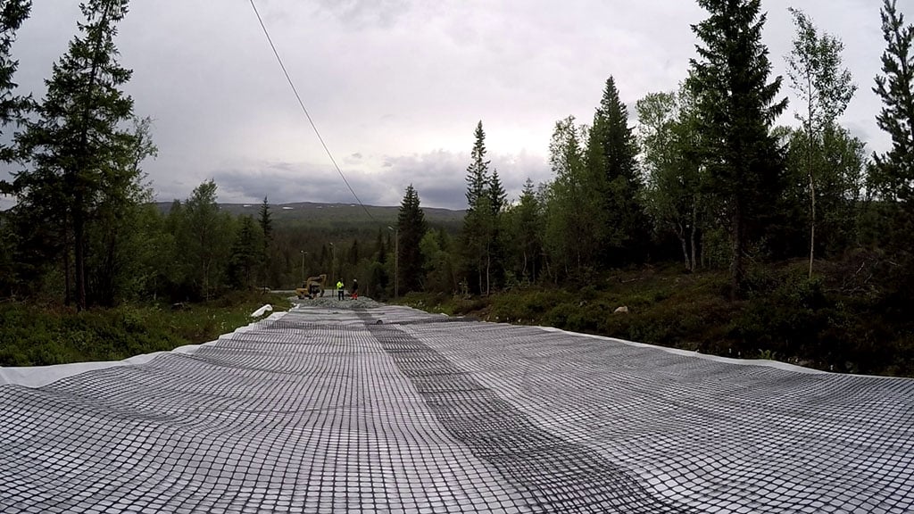 - Redusert massetilførsel: Armering reduserer behovet for tykke forsterkningslag. Det betyr mindre uttak og transport av pukk, lavere anleggskostnader og betydelig lavere CO₂-avtrykk.