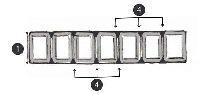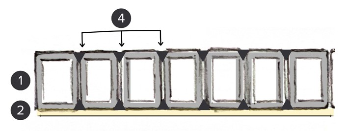 Skisse 3: Tverrsnitt av rør av type "H" er en rektangulær profil (❶) med en jevn vannvei (❷) og sveisefuger (❹) mellom profilene.
