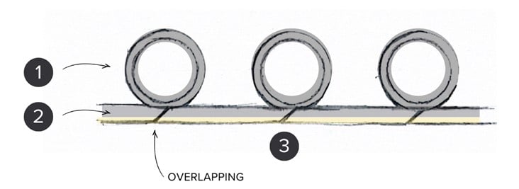 Skisse 1: Tverrsnitt av rør av type "B" er en enkelt Omega-profil (❶ ❷) med overlapping (❸) i midtseksjonen av hver profil.