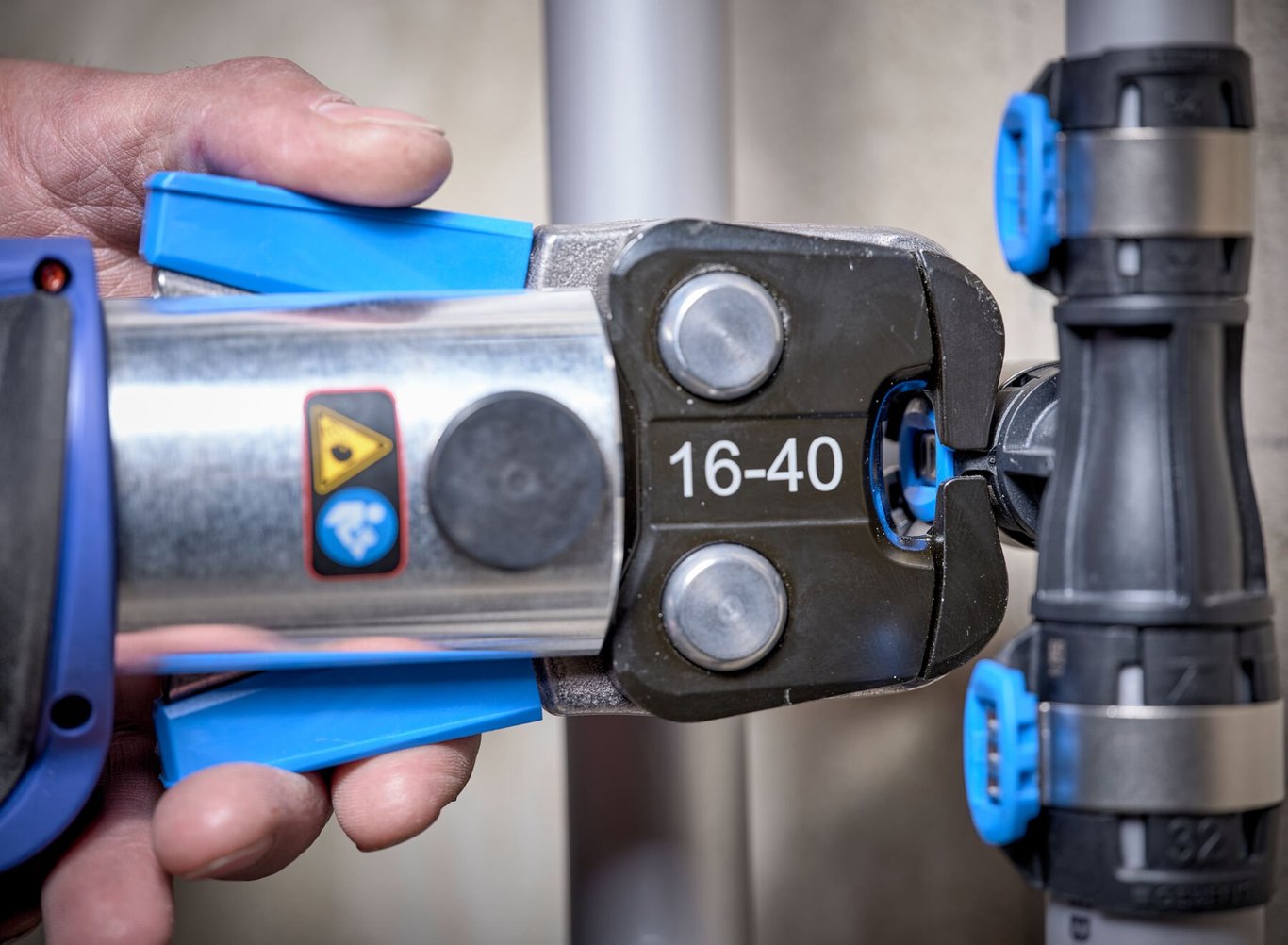 Alternativt er det mulig å bruke en håndbetjent presstang for mindre diametere på d16-40. Og takket være den optimale kraftoverføringen er kraften som kreves for å presse Geberit FlowFit D40 den samme som kraften for å presse Geberit Mepla d26.