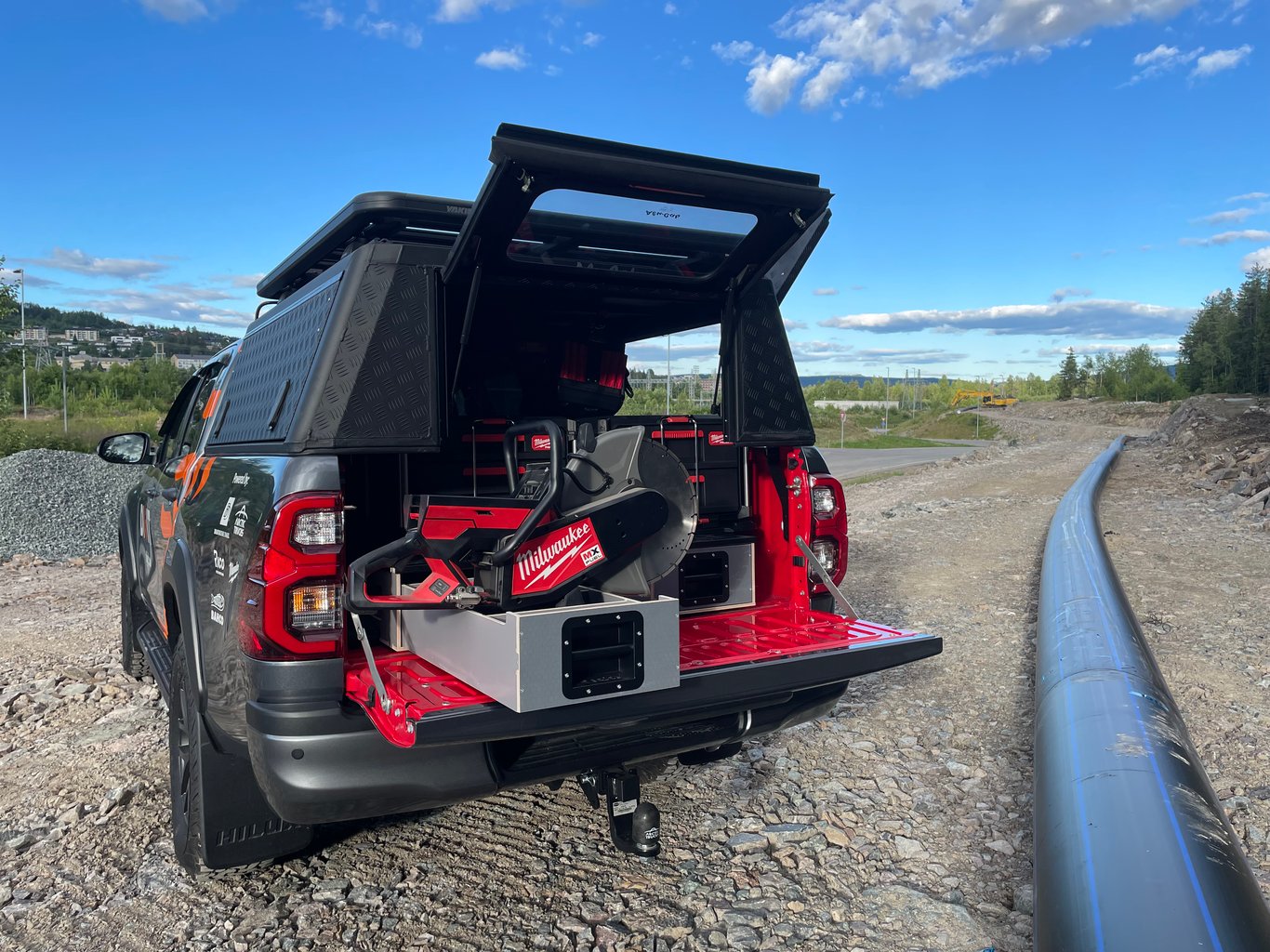 Verktøy og innredning er en sentral del av det å ha en enkel hverdag. Derfor har DIGIT-bilen spesialtilpasset innredning fra Rico. For å løfte det enda ett hakk, har vi skreddersydd vår egen laste-løsning ved hjelp av PACKOUT-systemet fra Milwaukee. Det gjør at vi kan stable og låse kofferter, verktøykasser og vesker akkurat slik vi ønsker. Skuffer og esker er selvfølgelig fylt med det råeste elektroverktøyet på markedet - det også levert av Milwaukee. I tillegg er bilen utstyrt med premium håndverktøy fra Bahco, som inneholder alt fra momentnøkler til tenger - i en kvalitet som varer i generasjoner.